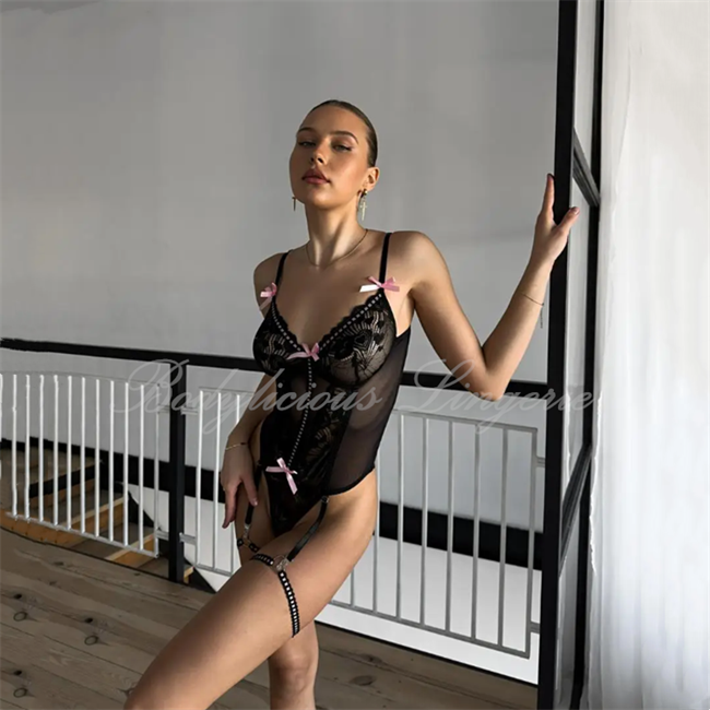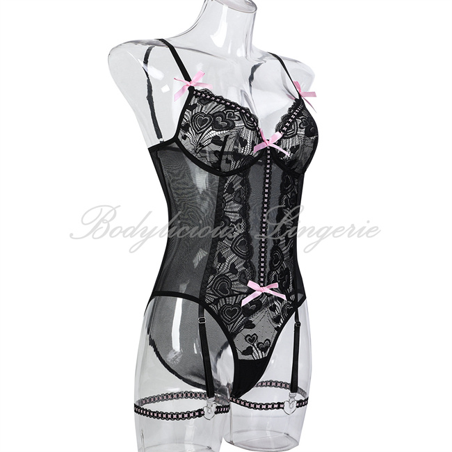 This lingerie set features black heart-patterned lace, pink bow details, and a corset-style bodysuit with matching garter belts.