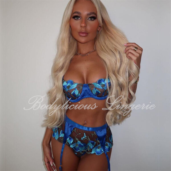 This blue sheer lingerie set, adorned with delicate floral embroidery, blends elegance and allure. The sheer fabric and satin accents create a romantic, seductive look for intimate moments.