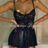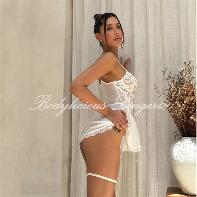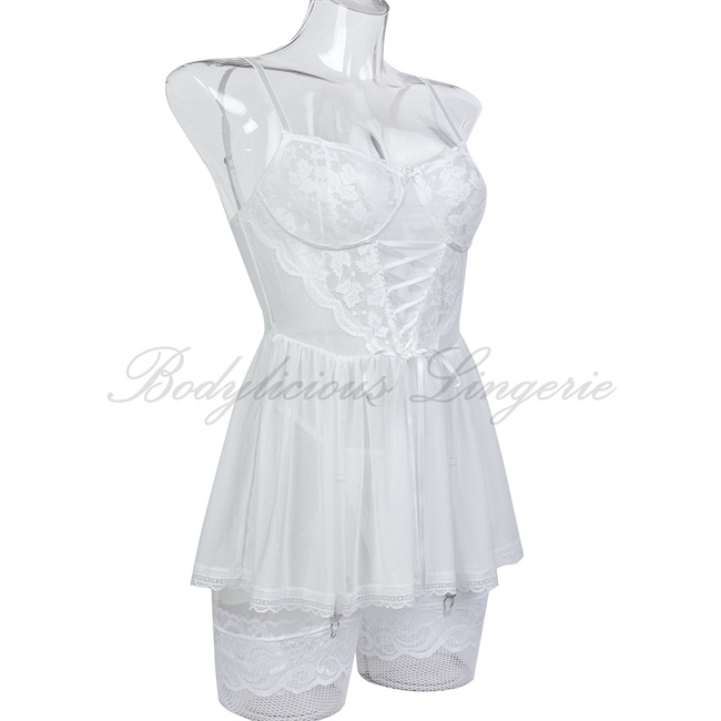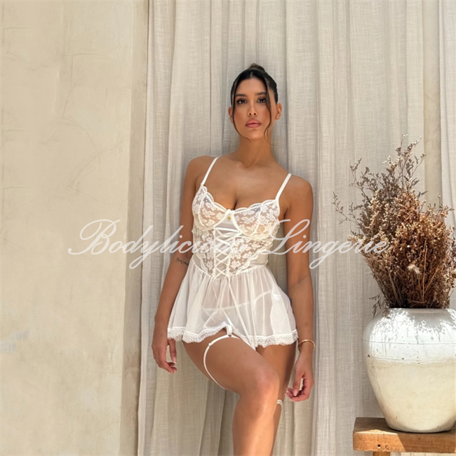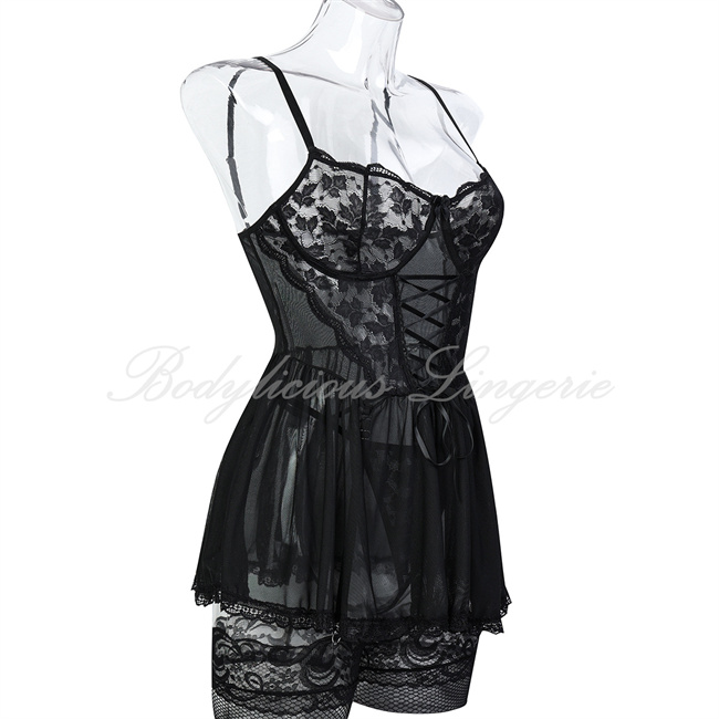 This lingerie set features intricate floral lace, a corset-style bodice with lace-up detail, and a sheer mesh babydoll skirt with matching lace stockings. The blend of structured corset support and flowing babydoll silhouette creates a gothic-romantic aesthetic, balancing bold seduction with delicate femininity. Perfect for those seeking a mix of vintage charm and contemporary allure.
