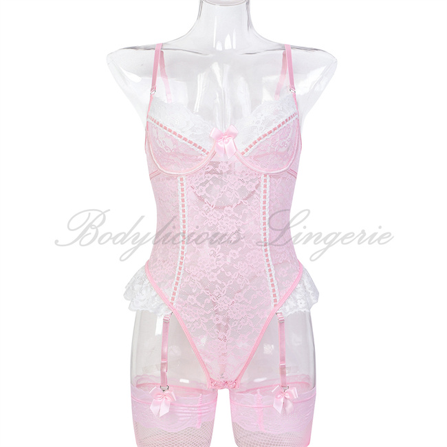 This lingerie set features pink floral lace with white lace accents, bow details, and matching garter belts with stockings.